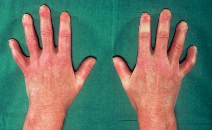 - изменение цвета (на холоде), боль и распухание пальцев рук;