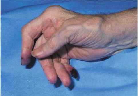 - При длительном воспалении в суставах формируется атрофия мышц, прилегающих к суставу, что приводит к снижению мышечной силы в конечностях. С течение времени формируются болевые контрактуры, подвывихи суставов кистей, стоп, крупных суставов.